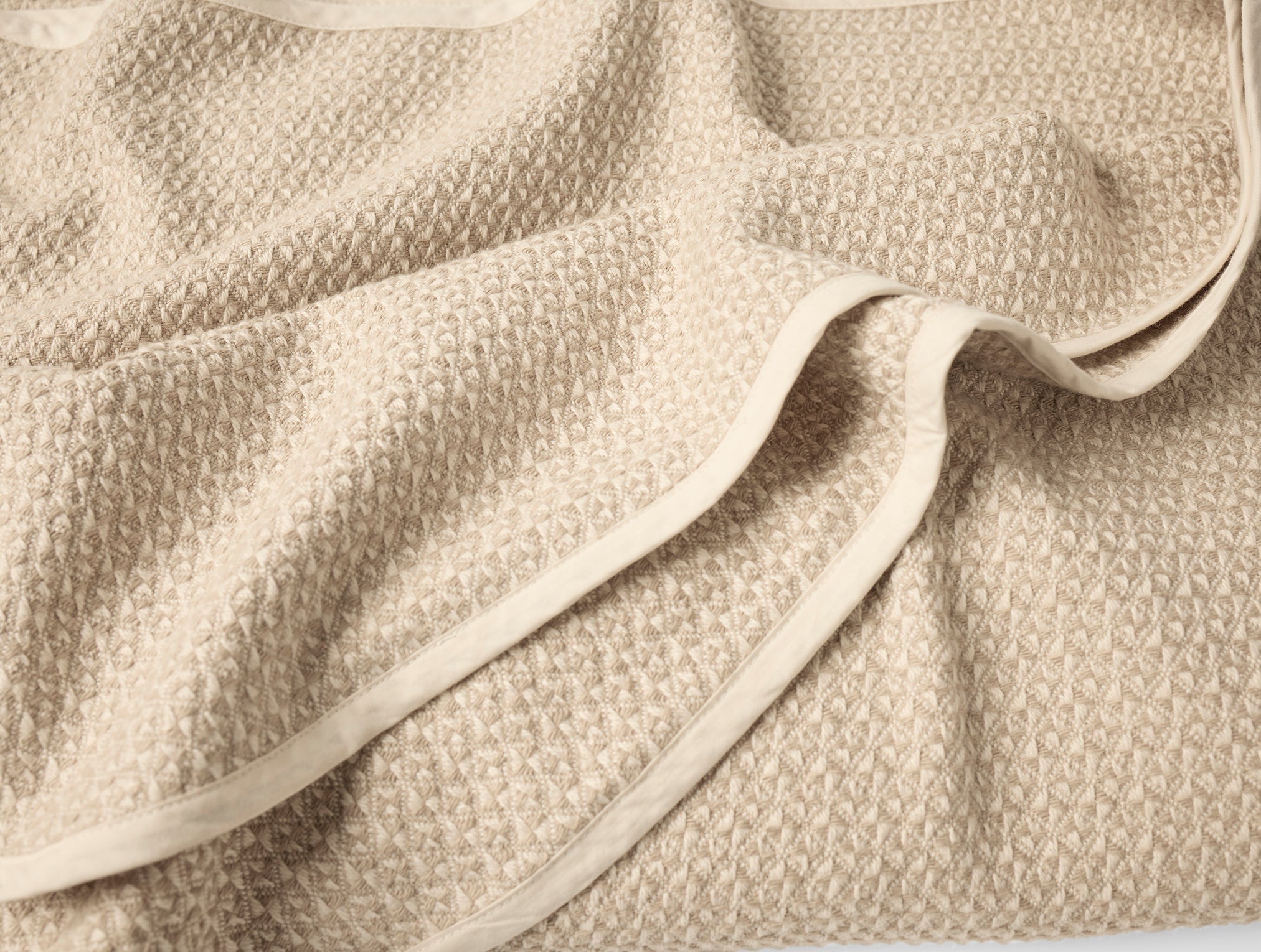 At home in any environment, this versatile layer is tightly woven into a textured jacquard that enhances the pure performance of organic cotton. The feel is soft and weighty, with rounded edges trimmed in color-matched percale fabric. Each blanket is pre-shrunk to retain its shape, year after year and wash after wash.